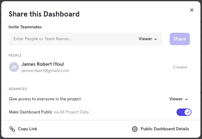 Important Note: Public Board Links are created with the context of the Data View in which the link is generated. Make sure to check the Data View you are currently in to ensure it is the one you want to share publicly.